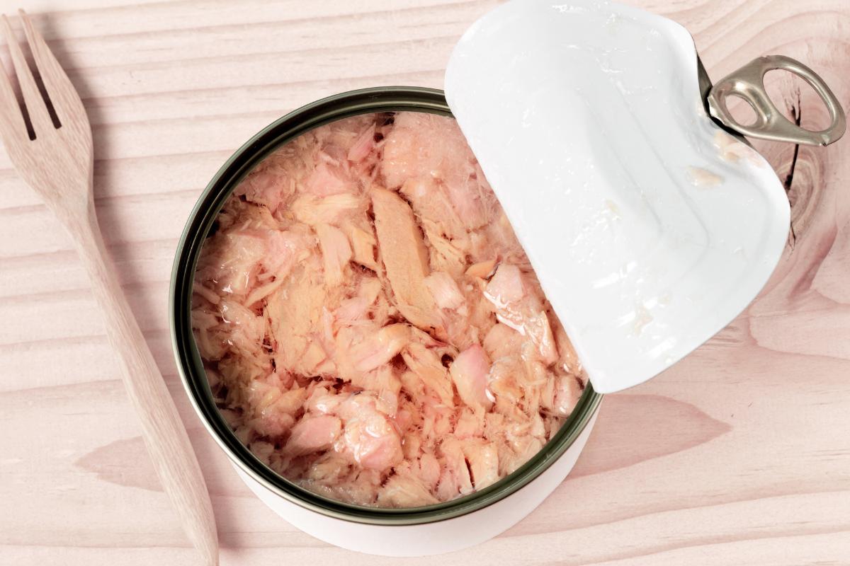 Encima de la base de patatas cocidas, añade una capa de 75 gramos de mayonesa. Sobre la salsa, pon el atún en conserva, escurrido y desmenuzado previamente.