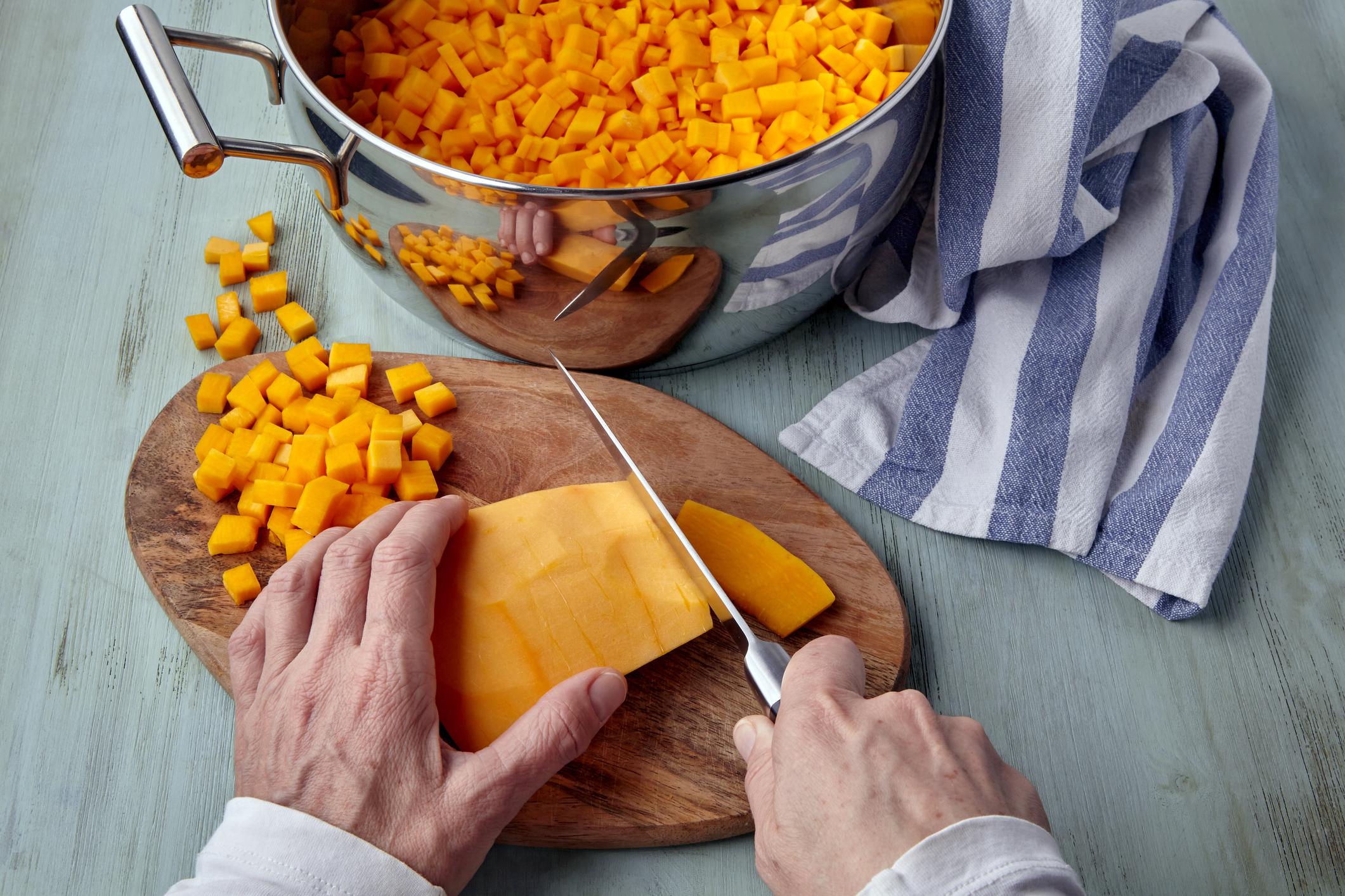 Para empezar con esta deliciosa receta de lasaña de calabazas y espinacas, comenzaremos por pelar y cortar la calabaza en trozos medianos y sin pepitas.