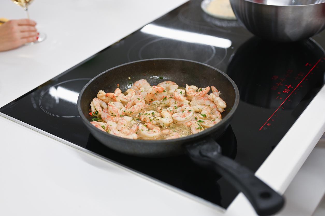 Los mejillones y los guisantes deben añadirse a la paella cuando lleve diez minutos cociéndose. A los cinco minutos deberemos añadir las gambas y bajar el fuego para que termine de hacerse.