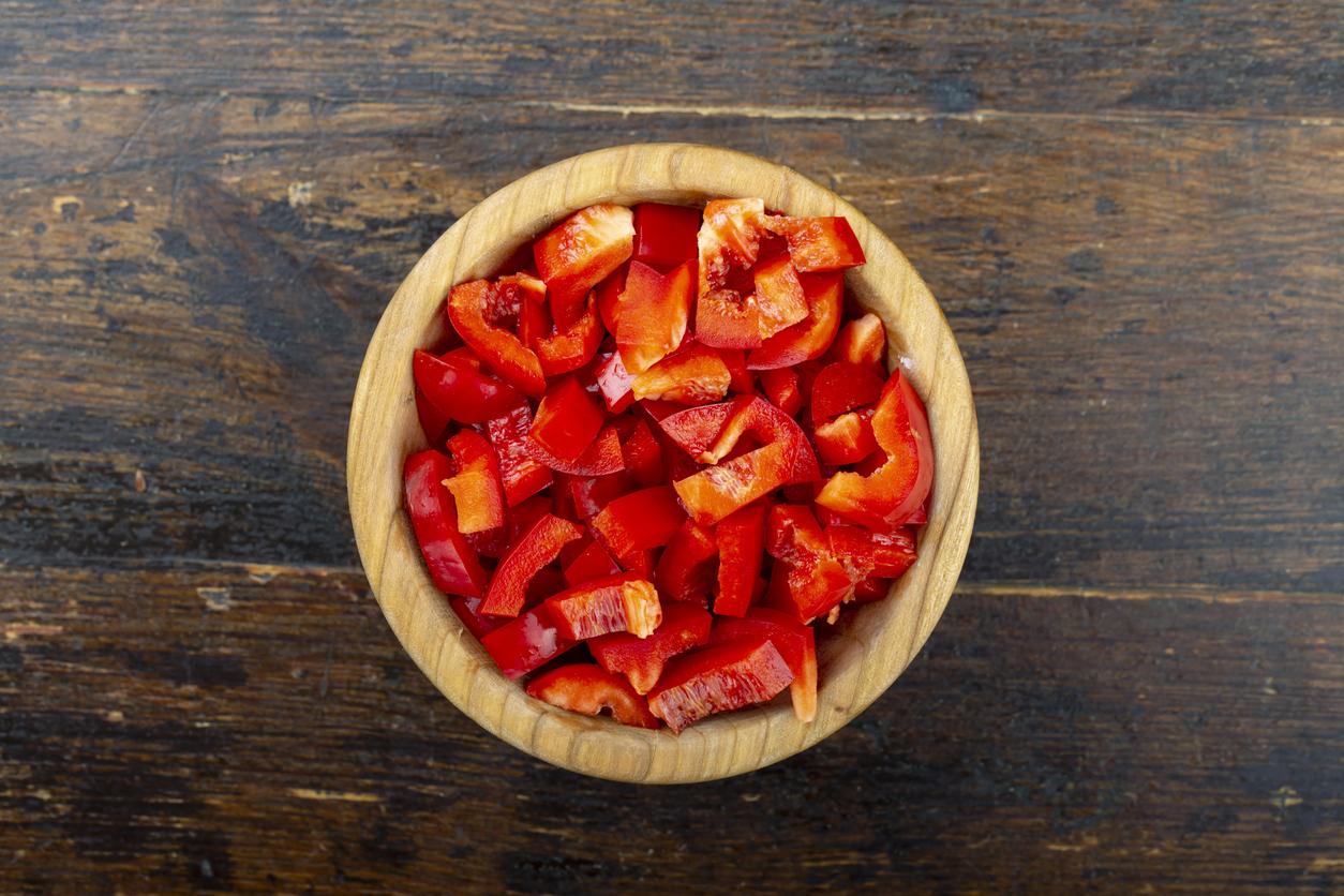 Ahora es el turno de los vegetales. Cogeremos el pimiento rojo y lo picaremos en trozos pequeños, lo mismo hacemos con el ajo y con el tomate. Lo rehogamos en la paella con un poco de aceite y lo saltemos durante unos 5 minutos para conseguir que empiecen a ablandarse.