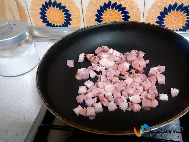 Por otro lado, deberás preparar el relleno para la quiche de espinacas, por lo que será necesario que pases el bacon ahumado cortado a tacos o tiras por una sartén. No será necesario que añadas aceite, ya que soltará su propia grasa y una vez que esté listo, deberás reservarlo sobre un papel de cocina para que absorba el exceso de aceite.