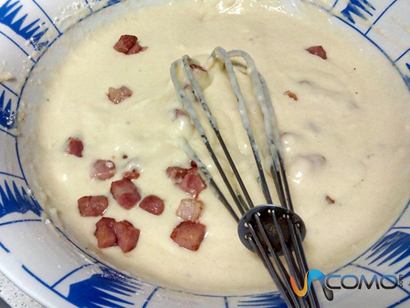 En un cuenco o bol grande, deberás batir los huevos con un poco de sal y agregar después el queso rallado y la nata líquida, junto con un poco de pimienta negra molida. Remuévelo todo bien para conseguir una mezcla homogénea y añade después el bacon que habías reservado.