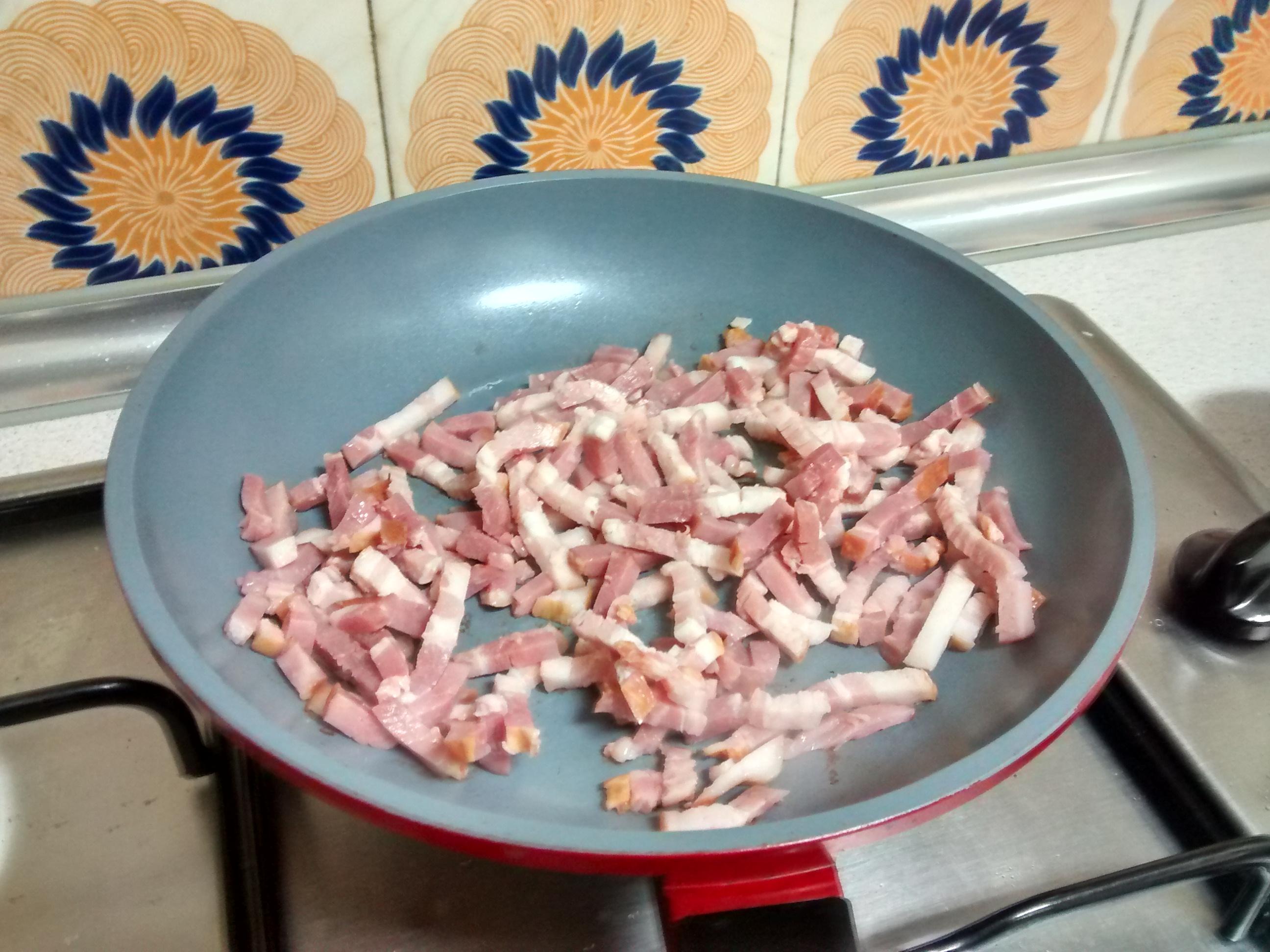 Por otro lado, deberás ir preparando el bacon o panceta, de modo que deberás cortarlo a tacos o tiras -a no ser que ya lo hayas comprado troceado- y pasarlo por la sartén para que coja color. No será necesario que agregues aceite, ya que este alimento desprenderá su propia grasa. Una vez que esté dorado, podrás retirarlo de la sartén y reservarlo sobre un papel de cocina para que absorba el exceso de grasa.