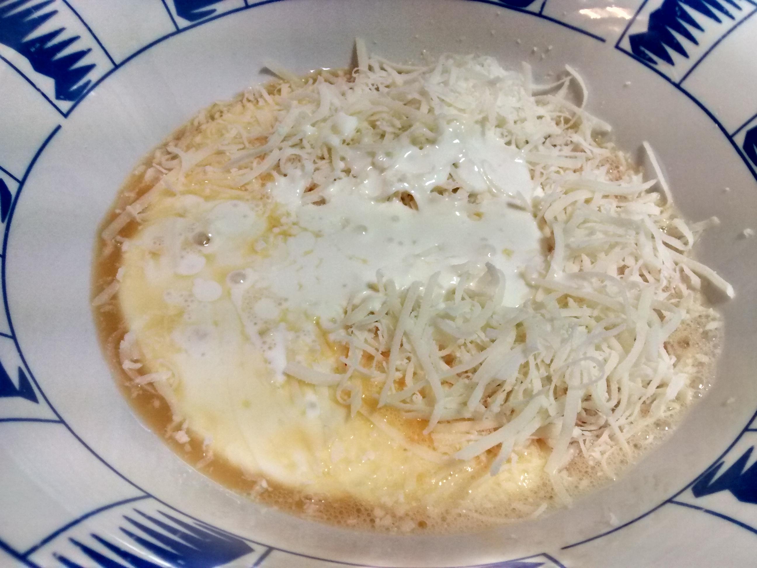 El siguiente paso será añadir a los huevos batidos la nata líquida o crema de leche, así como el queso que hayas escogido y pimienta negra molida, y con un tenedor mezcla bien para que todos los ingredientes queden integrados. Puedes optar por el que más te guste, aunque los más comunes que se utilizan son emmental o gruyère.