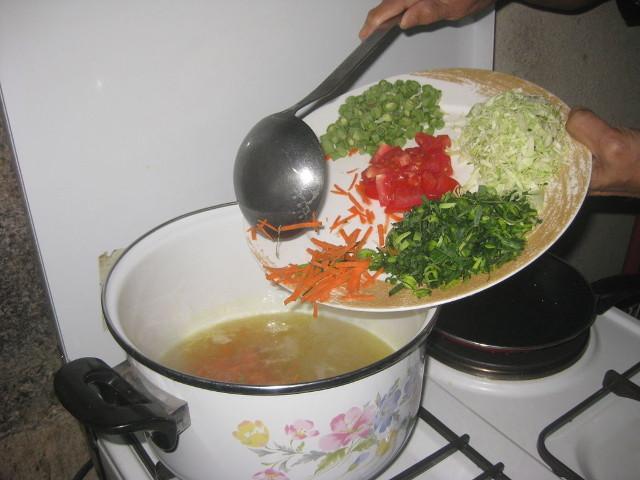 Calienta la olla y agrega 4 tazas de caldo de pollo o agua. A continuación, añade las verduras, el pollo, sal, pimienta, y comino en polvo, y deja que se cocine por 5 minutos.