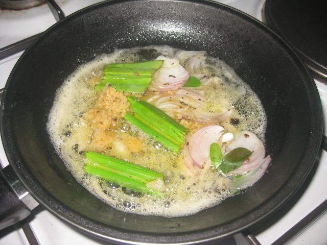Añade el jengibre, el ajo, la cebolla, el curry, y el aceite. Calienta hasta que su color es dorado y luego vierte la sémola, y mezcla, sirve que esté caliente la sopa de sémola.