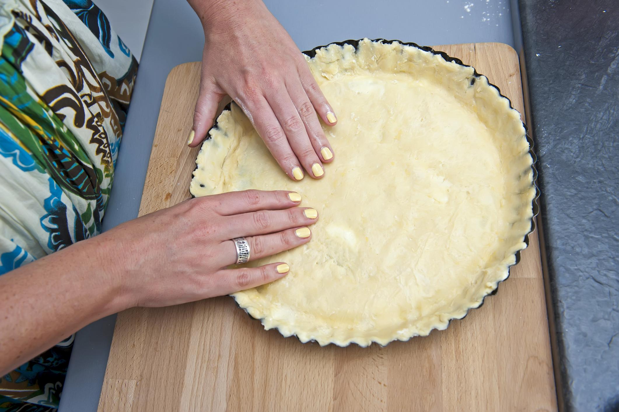Coge un molde de tarta con borde rizado o liso, como prefieras, de unos 24 – 26 centímetros y coloca sobre él la masa. Con tus manos, haz que quede totalmente adherida a la base y a los bordes. Acuérdate de pinchar con un tenedor el fondo y recortar con un cuchillo la parte de masa que sobre y sobresalga de la parte superior del borde.