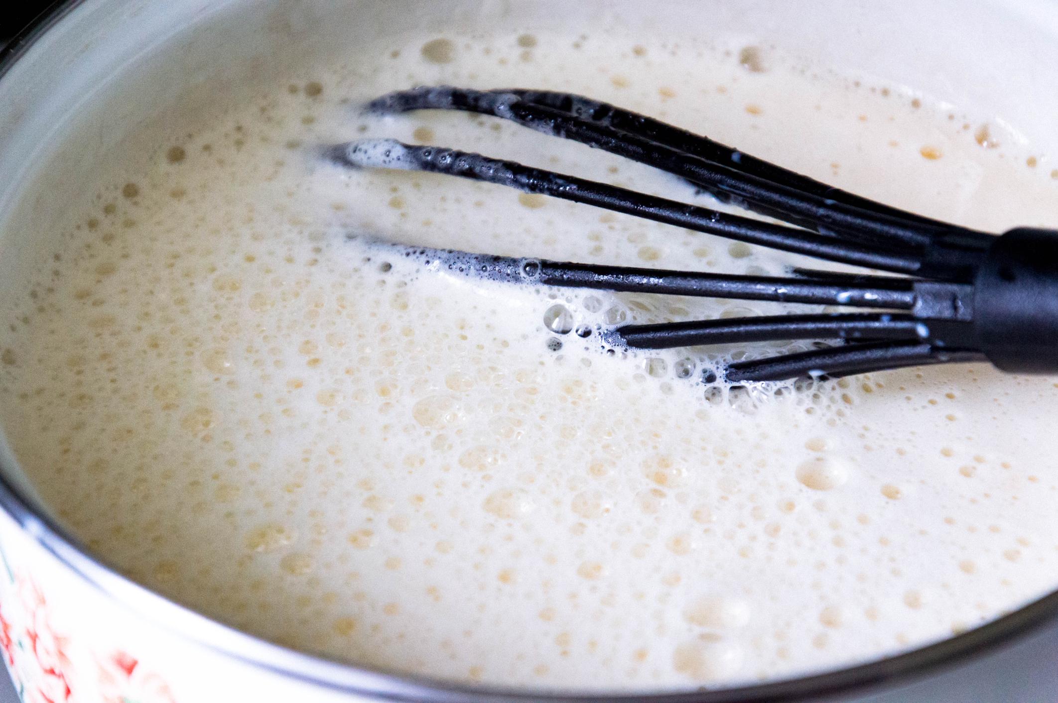 En un cazo, pon la leche a calentar. Añade el azúcar, la sal y el anís. Remueve con suavidad.