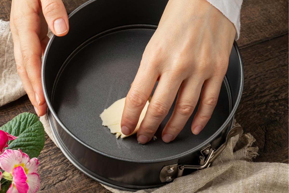 Engrasa y forra el molde donde prepararás la tarta de naranja. Para ello, puedes usar un poquito de alguna grasa, como la mantequilla, o papel vegetal y spray desmoldante.