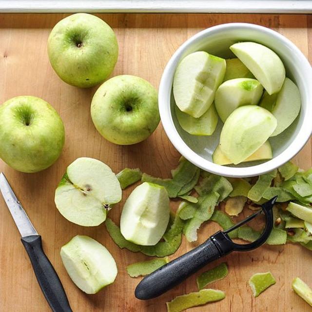 El primer paso para hacer una tarta tatín es que calientes el horno. Pela las manzanas, cortarlas en cuartos y elimina el corazón. Mantiene la masa para el pastel refrigerada mientras cocinas las manzanas.