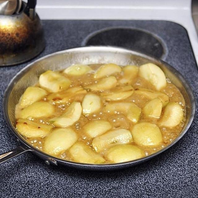 Funde la manteca en la sartén a fuego medio, agrega el azúcar. Será arenoso al principio, luego empieza a disolverse en un líquido viscoso. Cuando el azúcar y la manteca están burbujeando, agrega las manzanas y espolvorea con sal.