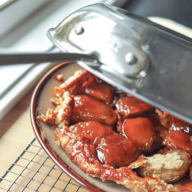 Pasa un cuchillo alrededor del borde de la masa de pastel para separarla de la sartén. Agita la sartén un par de veces para aflojar las manzanas en la salsa de caramelo. Coloca la bandeja donde vas a servir en la parte superior de la sartén. Usando guantes de cocina, agarra la bandeja y la sartén, y gira la tarta.