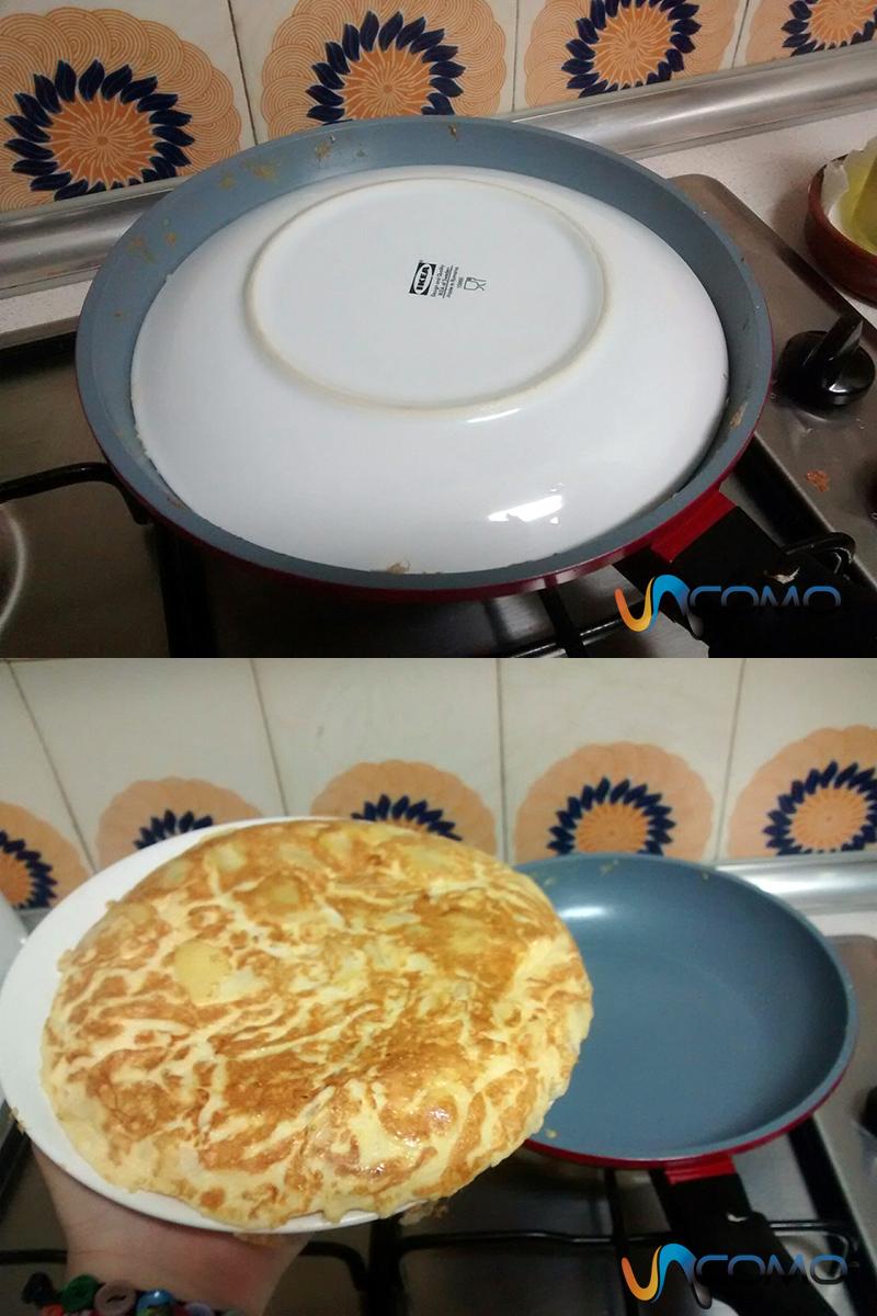 Una vez que veas que la tortilla está ya un poco cuajada y se está dorando, ayúdate de un plato, la tapadera de una cacerola o un utensilio específico para dar la vuelta a la tortilla. Colócalo sobre la sartén y girala, de modo que luego podrás volver a echarla a la sartén que se cocine por el otro lado.