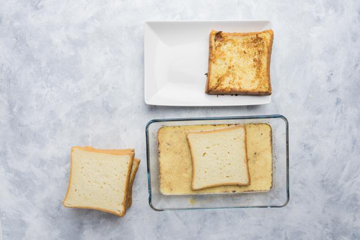 Cuando todos los ingredientes de la mezcla para estas tostadas francesas originales estén integrados, sumerge los panes de molde y deja que absorban la mezcla. Esto tomará unos 30 segundos.