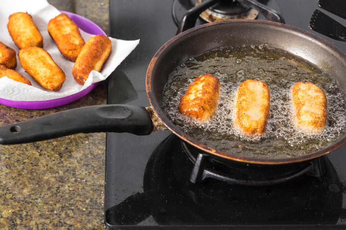 Sácalas para freírlas. Se pueden freír estando a temperatura casi ambiente o congeladas. Se fríen en una freidora, sartén o cazuela alta, con abundante aceite de oliva extra virgen. Este proceso se hace a fuego alto y se va regulando el fuego para evitar que se quemen.