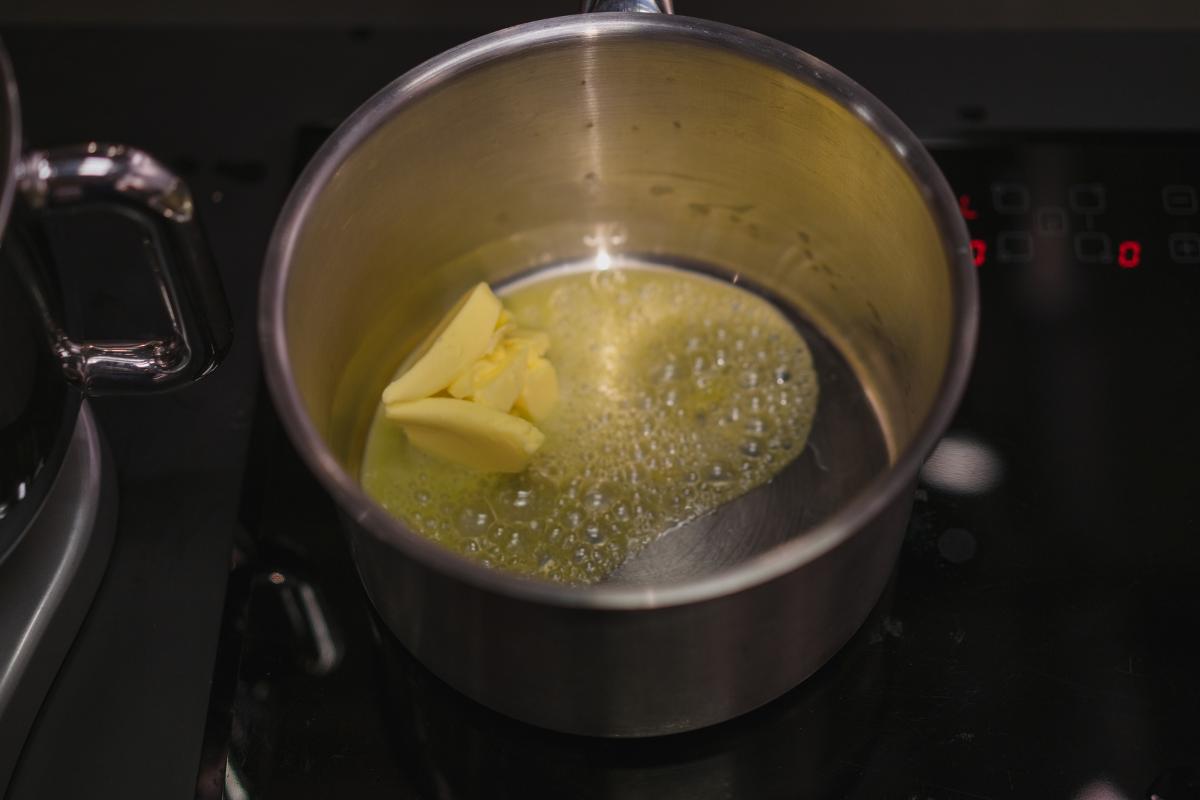 Coloca la mantequilla en otro cazo y caliéntala hasta que se derrita, también a fuego bajo. El color se tornará avellana y saldrá un poco de espuma que, si lo prefieres la puedes retirar. Si quieres, en este punto, puedes añadir un poco de aceite de oliva, el cual le dará un sabor muy rico.