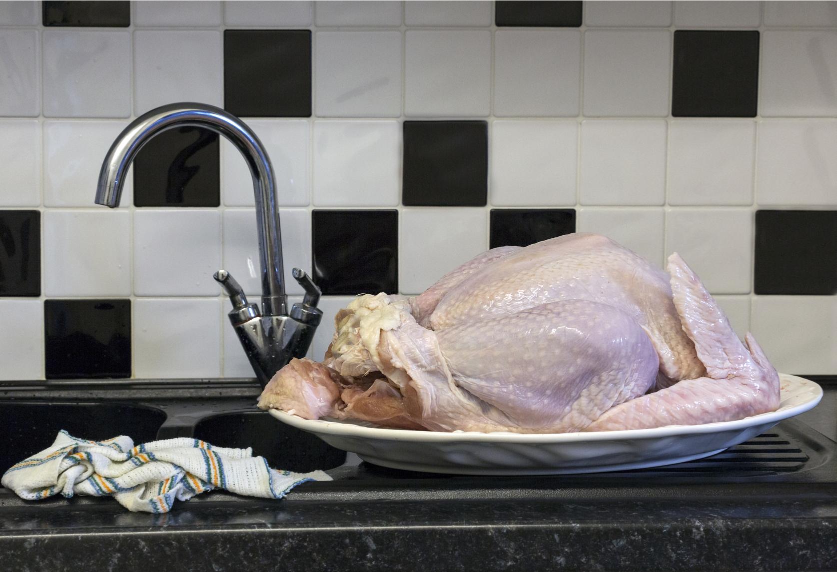 Al día siguiente, saca el pavo de la nevera y precalienta el horno a 220 °C. Mientras se calienta, enjuaga el pavo en agua fría para remover los restos de la mezcla de marinado. Sécalo con papel absorbente.