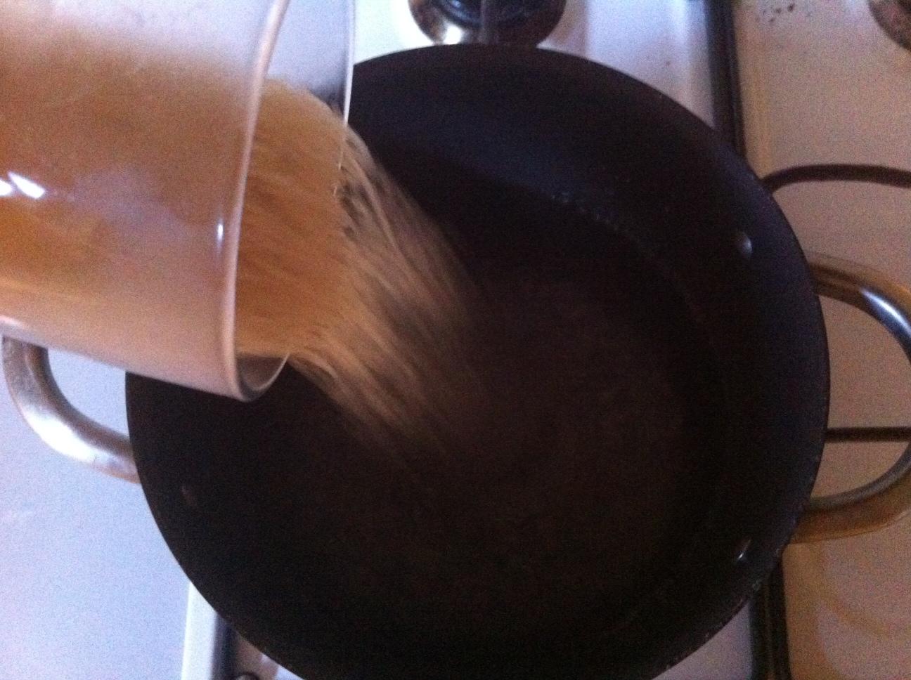 En el momento que esté hirviendo añade el arroz. Verás que cuando echas el arroz el agua dejará de hervir. Espera hasta que vuelva a hervir.