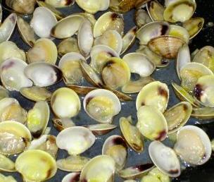 Escurrir las almejas y pasarlas a una cazuela, añadir el vino blanco y calentar hasta que se abran. Retirar las almejas abiertas y reservar. Colar el caldo de la cocción, ponerlo en un recipiente y añadir el zumo de naranja y unas hebras de azafrán, Reservar.