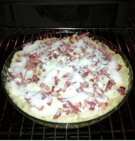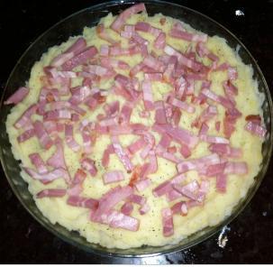 Abre el horno y añade el queso rallado por encima del beicon y cubriendo también todo el puré. Gratina durante dos o tres minutos.