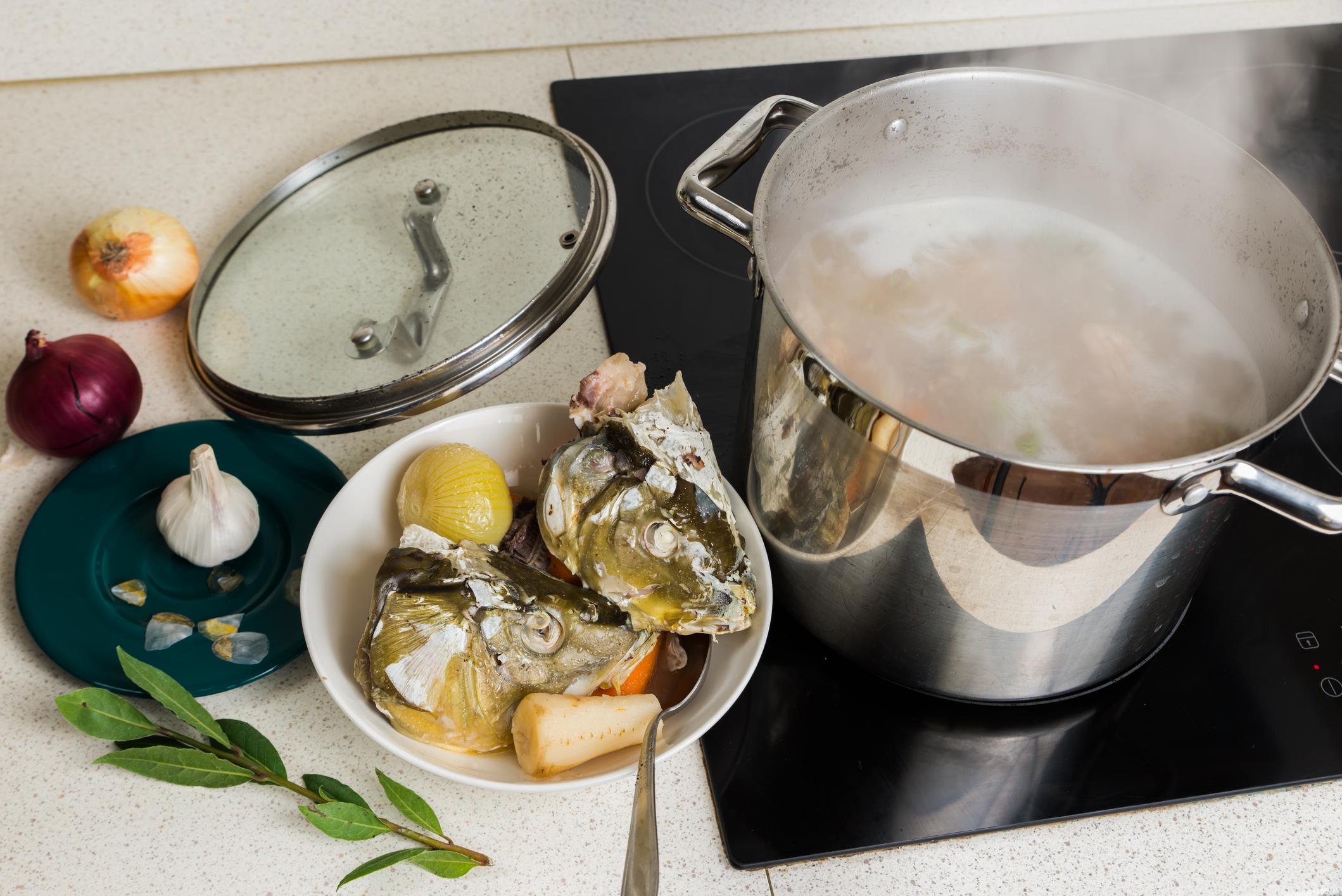 Para hacer el caldo de tu sopa bullabesa, pon a hervir las cabezas de los pescados que hayas elegido, junto a los mejillones y las cabezas y cáscaras de los langostinos o gambas. Hiérvelo todo junto en el agua, unos 10 minutos, con un poco de sal gorda y unas hojas de laurel. Cuando lo tengas, apaga el fuego, cuela el caldo resultante y resérvalo. Reserva también los mejillones.