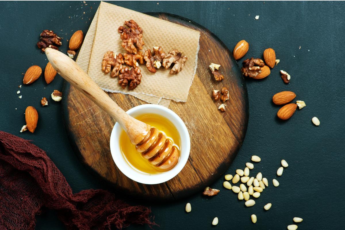 Prepara el aderezo o aliño. En un bol, agrega las nueces trituradas, el aceite de oliva, la sal, el vinagre y la miel. Bate todo esto con un tenedor.
