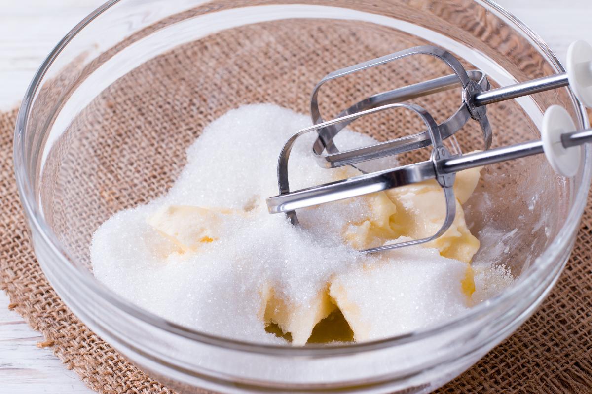 En un bol grande, bate la mantequilla con el azúcar hasta obtener una crema suave y blanquecina.