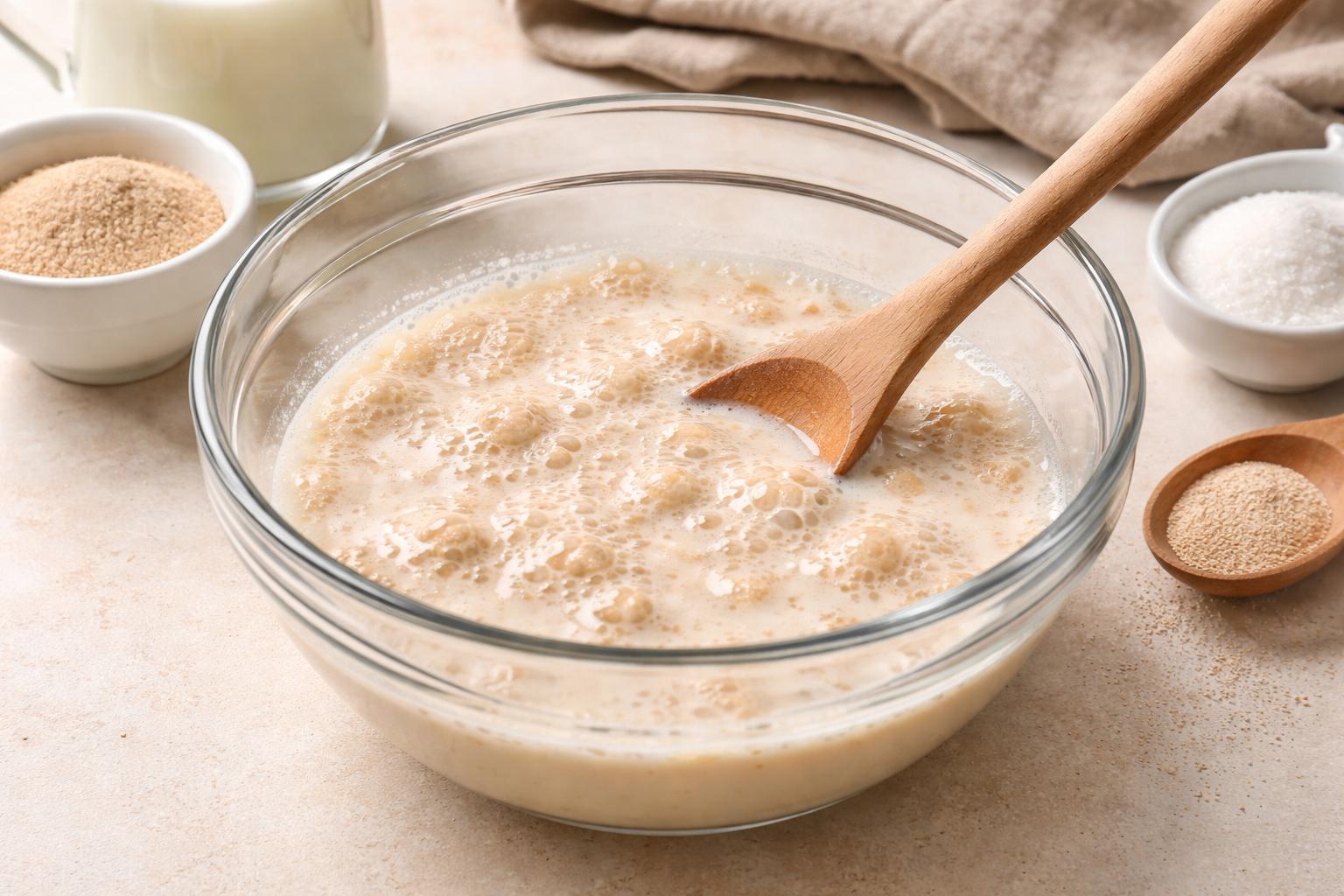 El primer paso para hacer un auténtico panquemado valenciano es activar la levadura. Para ello, coge un bol pequeño y disuelve la levadura fresca en la leche tibia. Remueve bien hasta que ambos ingredientes queden completamente integrados. Este paso es esencial para que la masa fermente correctamente y consigas un pannquemao con una miga muy esponjosa.