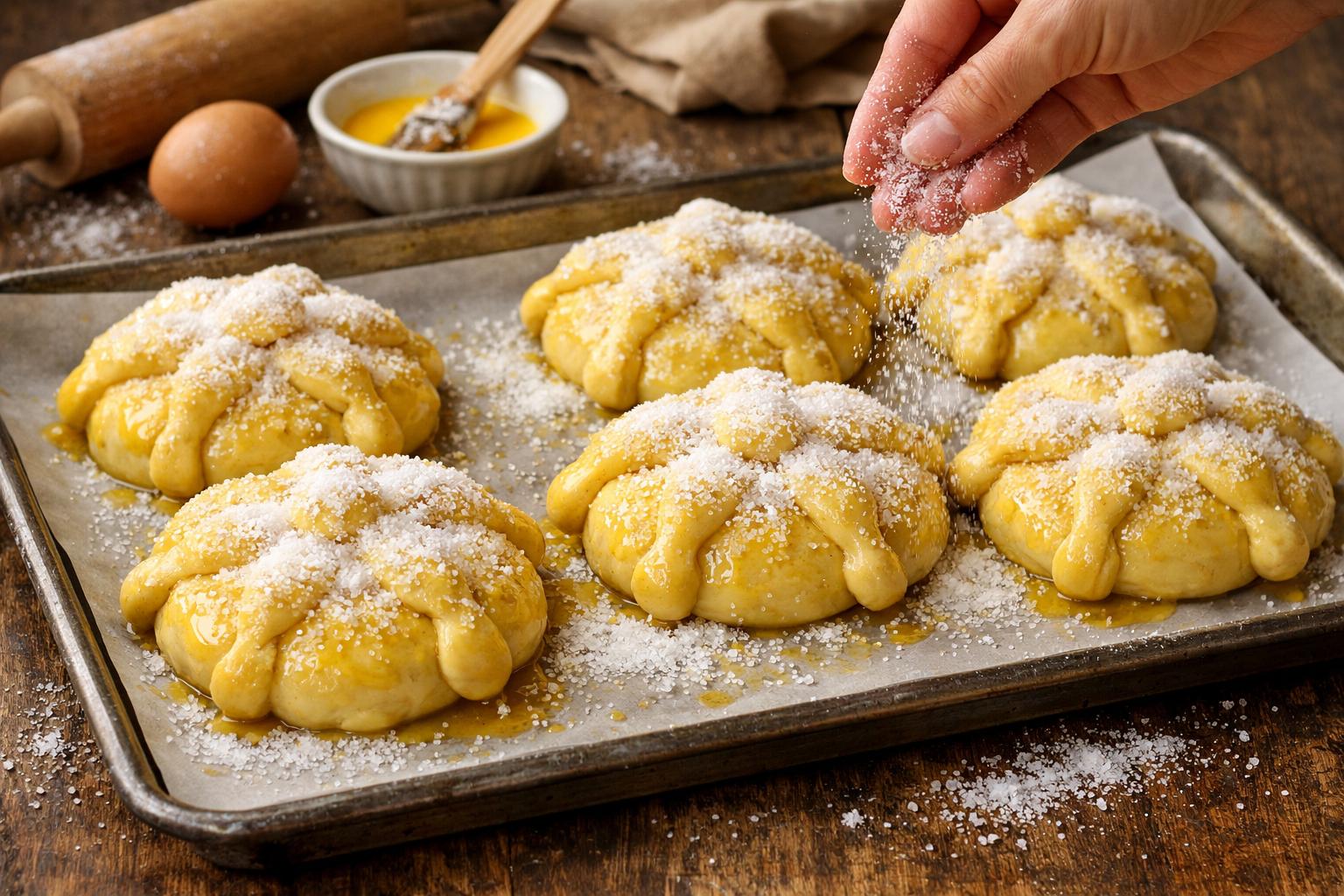 A continuación, precalienta el horno a 180º C. Antes de hornear el panquemado valenciano, forma bolas de masa y dales forma redonda, como de bollitos de pan. Después, pinta la superficie del pan dulce con huevo batido y espolvorea el azúcar por encima para que durante el cocinado se forme la corteza dorada característica de este delicioso dulce.
