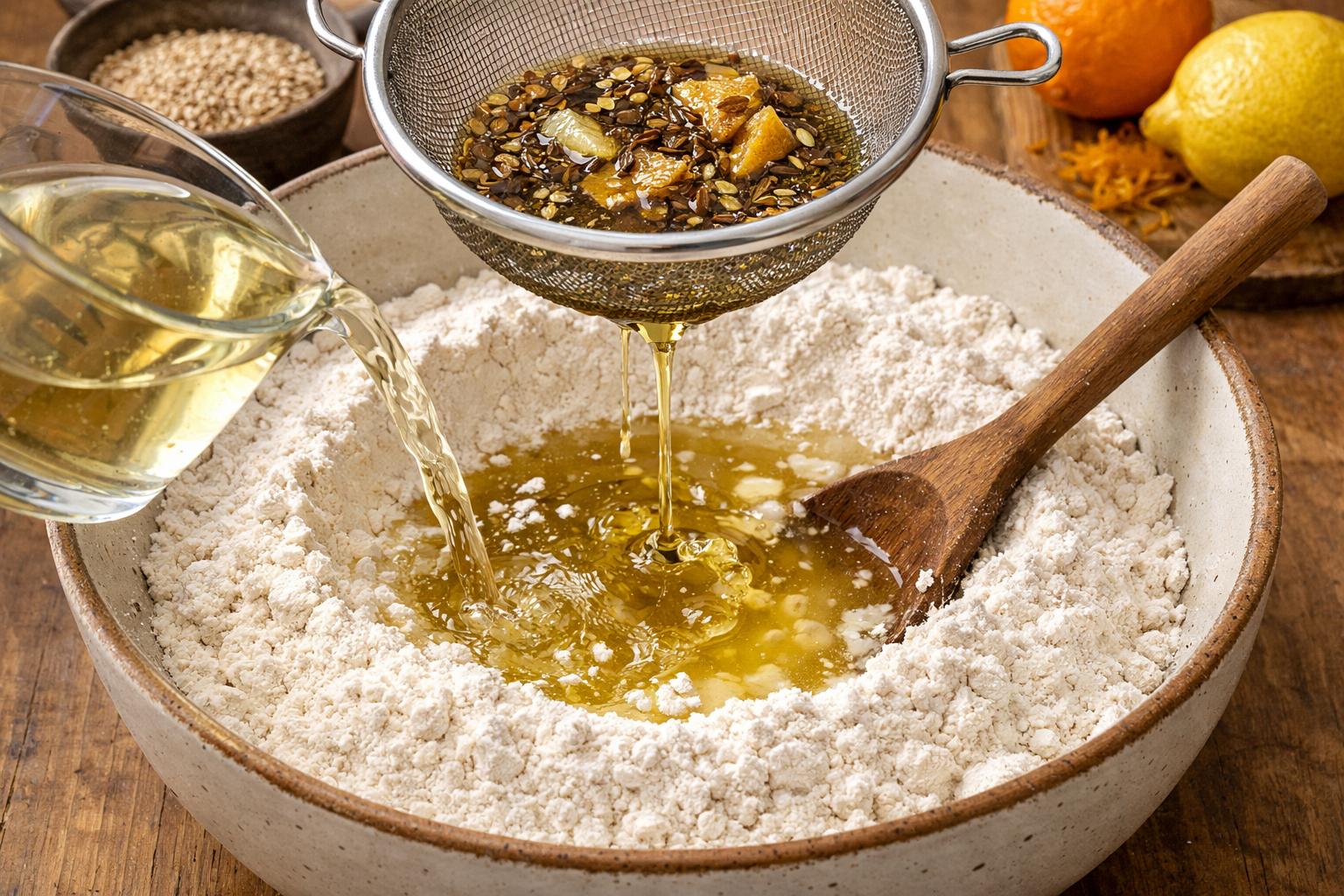 Cuela el aceite para retirar las semillas de anís y las pieles de los cítricos. Una vez templado o frío, viértelo en el centro de la harina. Ahora sí, ha llegado el momento de darle sentido a esta receta de pestiños de vino de la abuela andaluces: añade el vino blanco y comienza a mezclar con una cuchara de madera o con las manos hasta formar una masa.