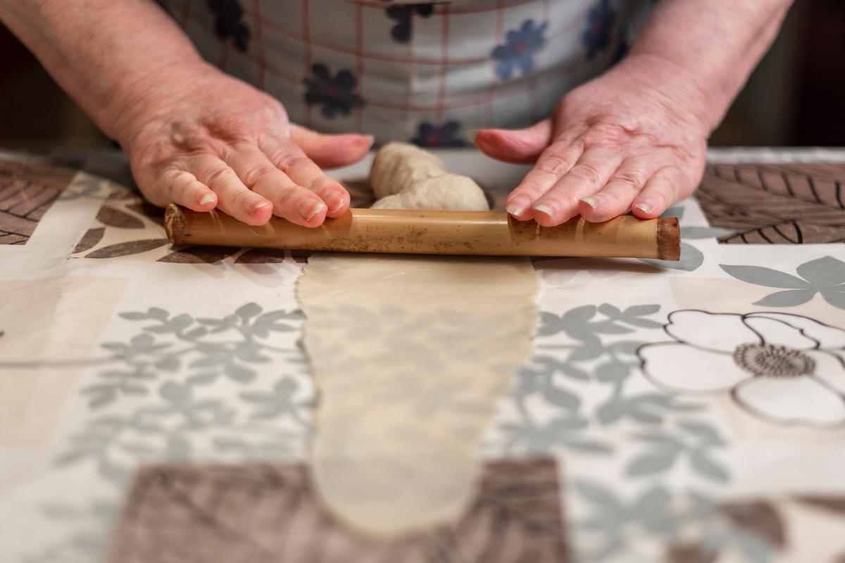 Una vez reposada, divide la masa en pequeñas porciones. Con ayuda de un rodillo, estira cada porción sobre la encimera hasta obtener una lámina fina de unos 2 o 3 milímetros de grosor.