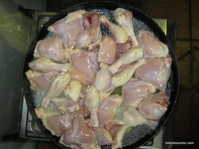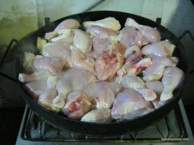 Fíjate algo importante: Cuando el pollo comienza a calentarse también larga mucha grasa que se transforma en aceite. Para que la comida no resulte “pesada” debemos sacar, con un cucharón o cuchara grande, ese aceite amarillo que se acumula en el centro.