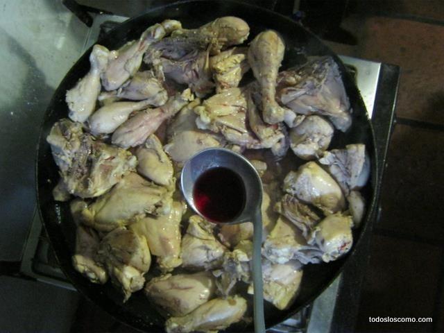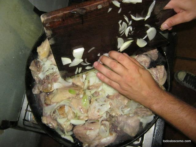 Cuando el pollo comienza a mostrase cocido y la carne permite que la pinchemos con un tenedor, agregamos 1 vaso de vino por persona (es para darle sabor, el alcohol se termina evaporando). Aprovechamos y agregamos la cebolla.