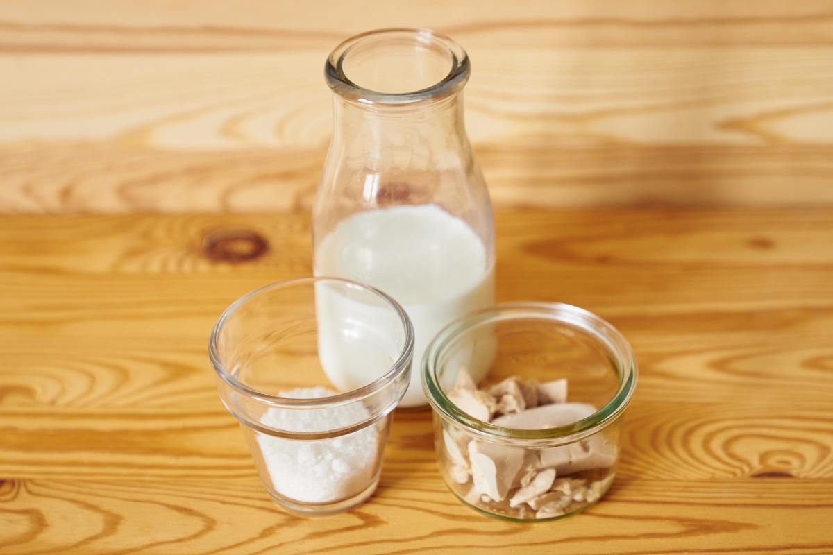 Desmenuza la levadura fresca en un bol pequeño. La mezclas con un poco de leche tibia y añade una cucharada de azúcar. Después, déjala reposar durante 10 minutos hasta que comience a espumar.