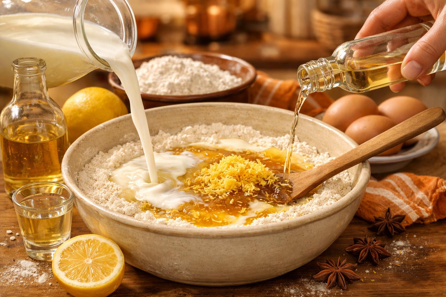 A continuación, incorpora la leche, el aceite de girasol suave, el anís y la ralladura de limón. Mezcla bien todos los ingredientes hasta conseguir una masa homogénea y muy aromática, ideal para unas rosquillas de anís caseras.