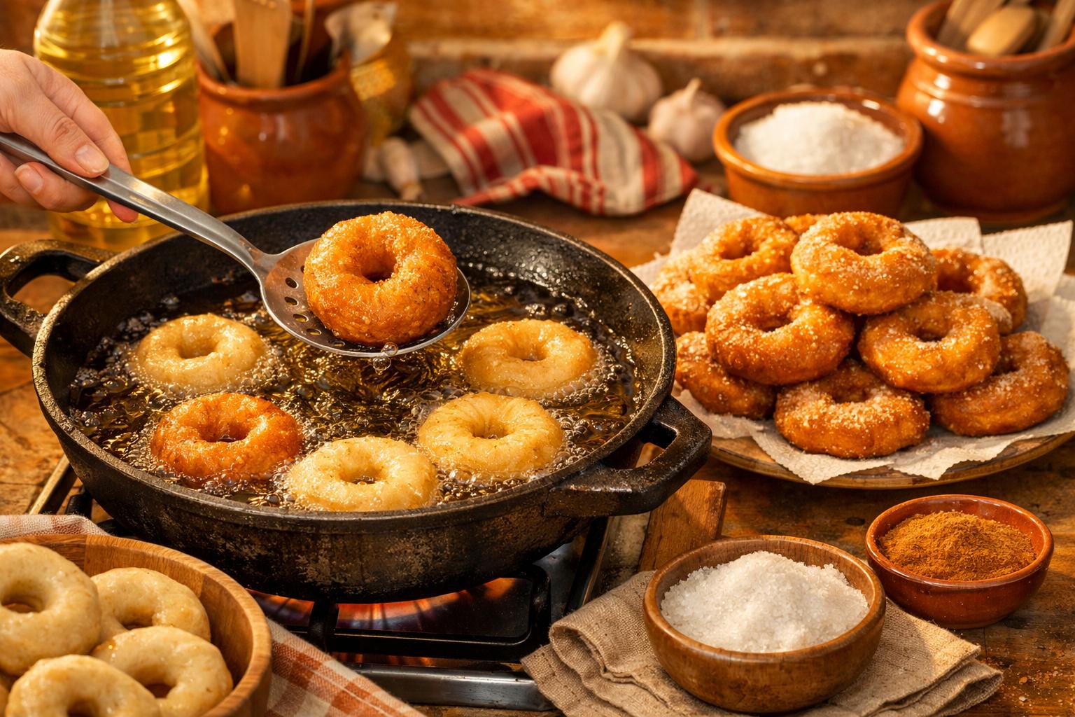 - Para lograr unas rosquillas doradas y crujientes por fuera pero bien cocinadas y esponjosas por dentro te recomendamos no calentar demasiado el aceite. Recuerda que si el aceite está muy caliente se dorarán muy rápido por fuera, pero pueden quedar crudas por dentro.