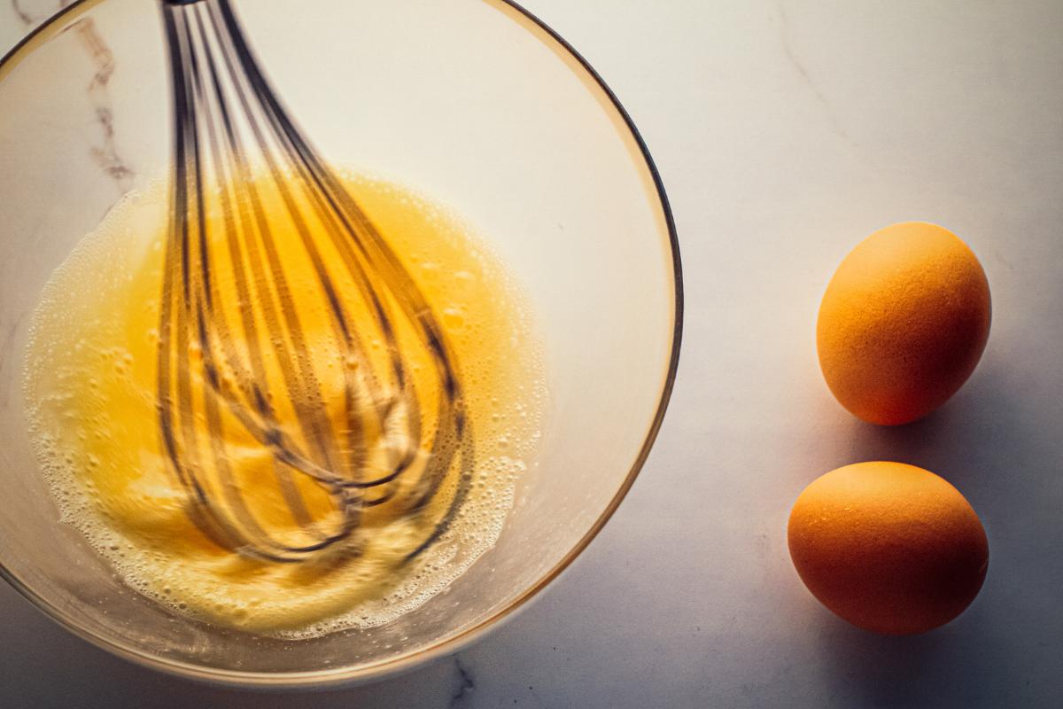 Tras conocer brevemente la historia de este postre, vamos con el primer paso de la receta. En un cuenco, echa 3 huevos camperos. Con unas varillas, los bates un poco y añade 100 gramos de azúcar. Continúa batiendo hasta blanquear.