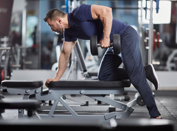 - Sujeta una mancuerna en la mano derecha y apoya la rodilla y la mano izquierda en el banco, sin flexionar la columna.