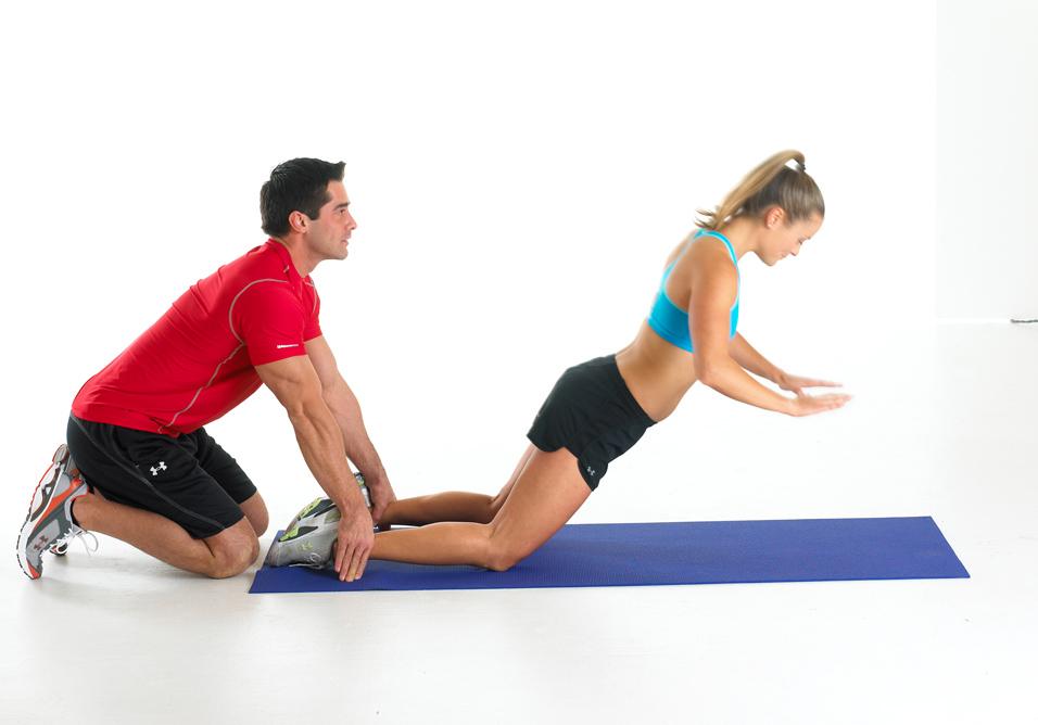 - Coloca los pies en un soporte que los aguante sin moverse. Puedes ponerlos debajo de una banca fija, una barra fija o puedes pedirle a un compañero que los sostenga mientras haces el ejercicio.