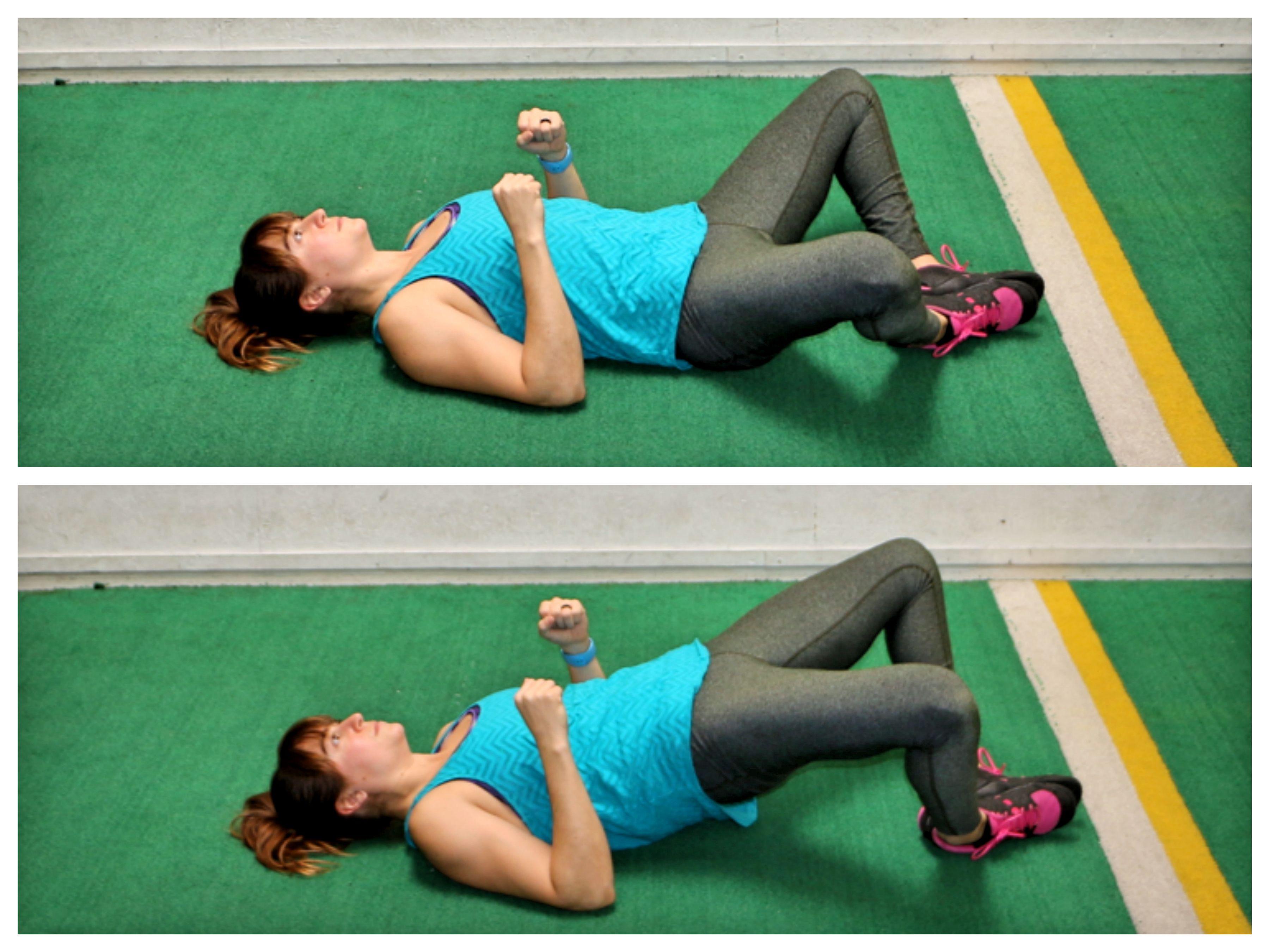 - Activa el abdomen y los glúteos para subir la cadera hasta la altura que puedas. Mantén esta posición por unos 10 segundos.