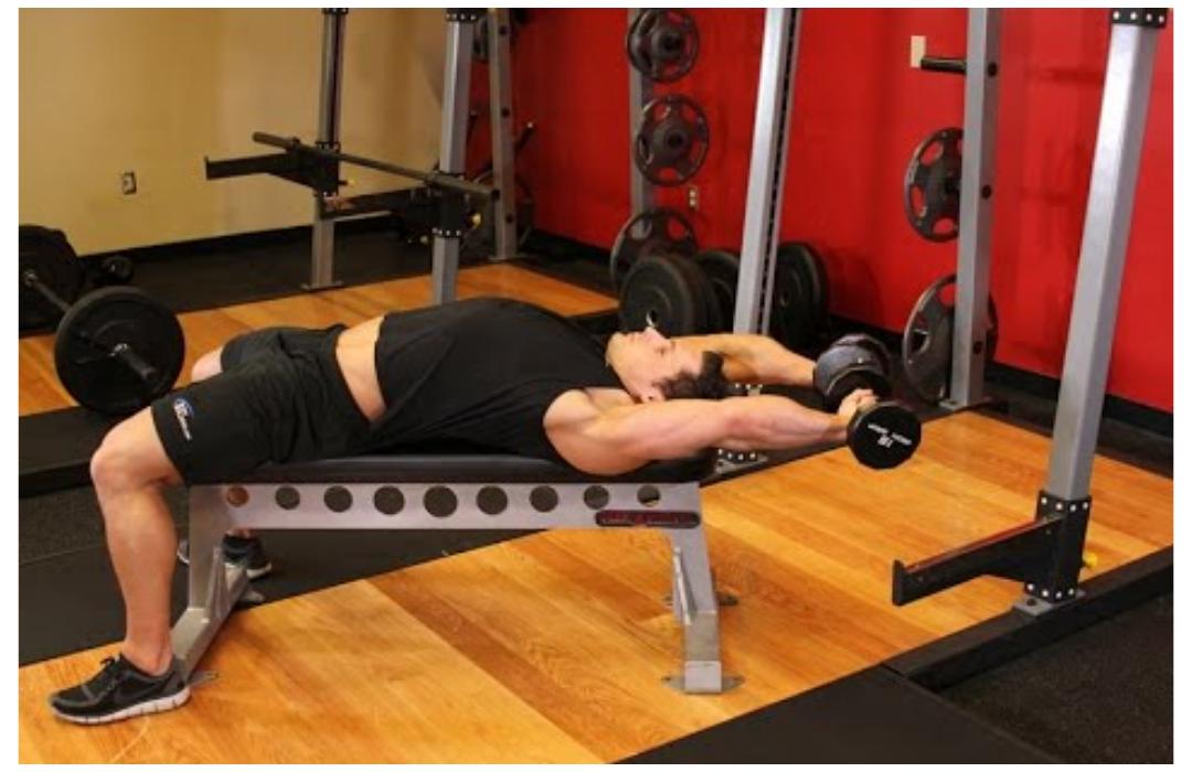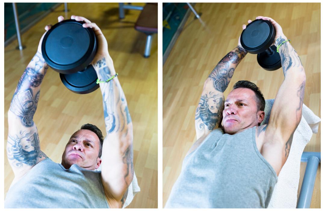 - Cuando la mancuerna esté arriba, realiza un movimiento descendente, manteniendo tus brazos lo más rectos posible, y llevando la mancuerna por detrás de tu cabeza en línea recta.