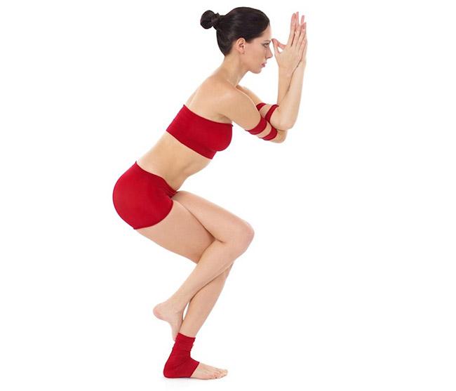 - Para hacer esta postura deberás ponerte de pie y doblar ligeramente las dos piernas, como si hicieras una sentadilla.