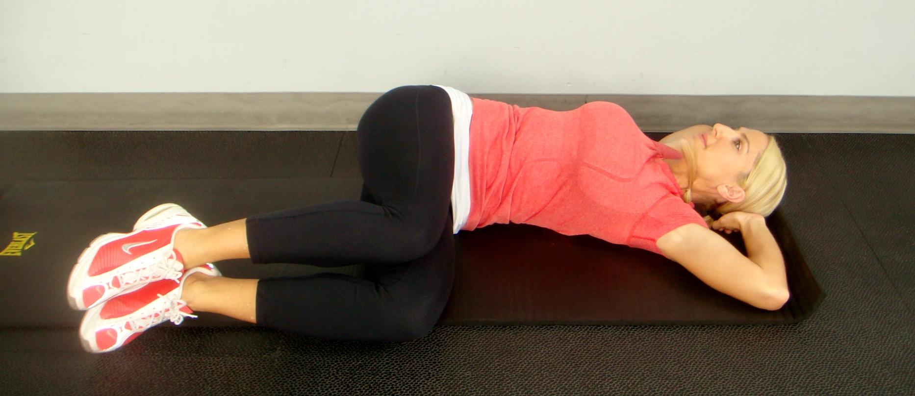 Ahora tendrás que colocarte de costado sobre la esterilla apoyando las piernas una encima de la otra, apoya tu cabeza sobre la palma de la mano flexionando el brazo y, en esta posición, comenzaremos el ejercicio. Se trata de elevar la pierna que tienes encima hacia lo máximo que puedas y, después, bajar despacio sin llegar a tocar al suelo; vuelve a elevar y haz 15 repeticiones.