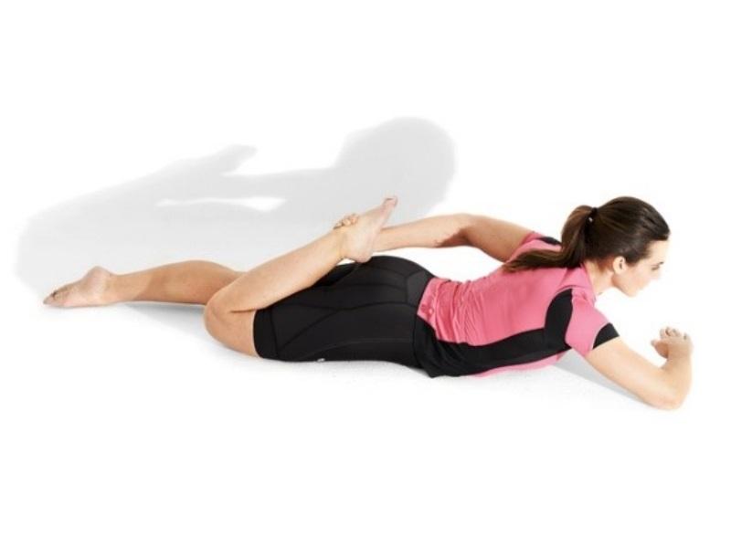 - Acostado en el lado derecho, agarra el tobillo izquierdo y colócalo detrás del cuerpo.