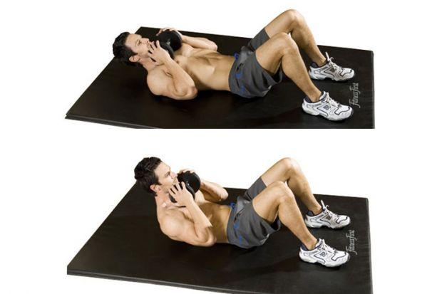 Para el segundo ejercicio también necesitas estar recostado sobre tu espalda y sujetar una pesa con las manos. Después, contrayendo siempre los músculos abdominales, extiende los brazos hacia arriba con la mancuerna agarrada por ambos lados e intenta levantar la parte superior del cuerpo como si fueras a sentarte y, poco a poco, vuelve a tumbarte sobre tu espalda.