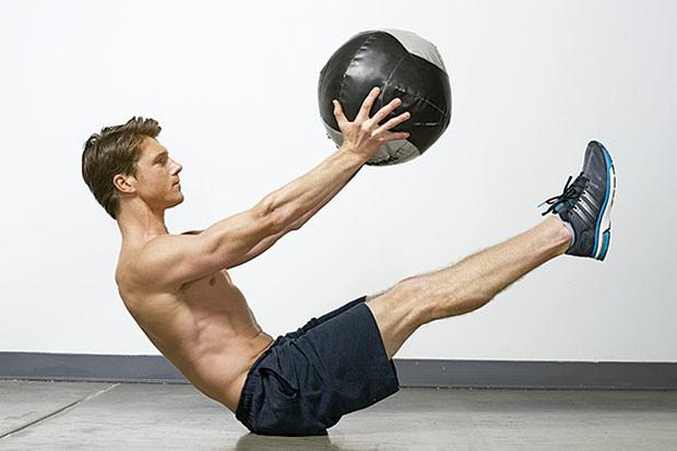 Otro de los ejercicios más adecuados para conseguir tener unos abdominales marcados consiste en hacer un tipo de ejercicio que se conoce como "abdominales en V". Tienes que sentarte sobre una colchoneta y aguantar una pelota con las manos, estirando los brazos a la altura de tus ojos.