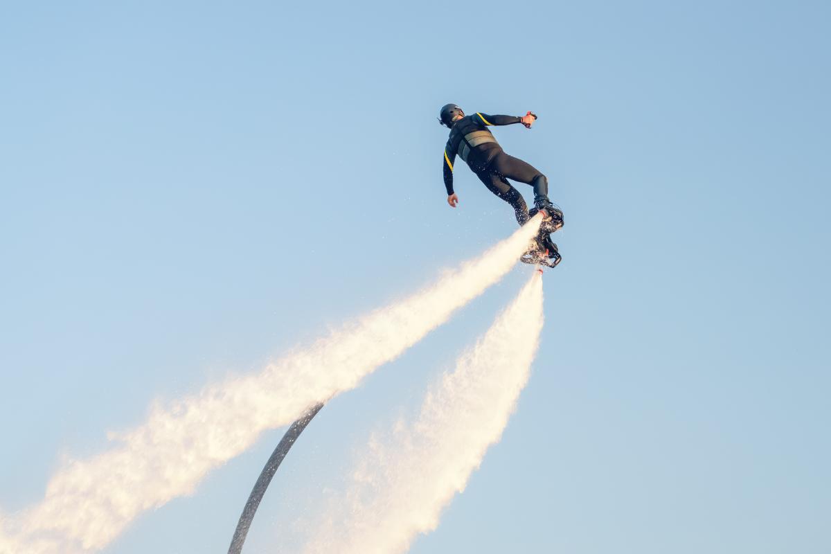 El jetpack acuático es una experiencia espectacular y futurista: volar sobre el agua impulsado por chorros de alta presión, como si fueras un superhéroe. Funciona con el mismo principio de propulsión que el flyboard, por agua, pero se lleva en la espalda, como una mochila. Permite vuelos más verticales y estables. Ofrece una sensación más cercana a un "cohete humano". Más intenso y algo más exigente físicamente.