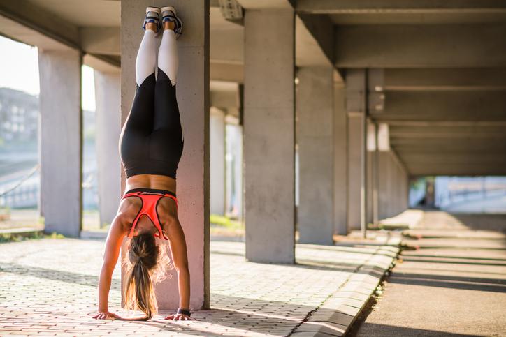 - Toma impulso como si fueras a levantarte sobre las manos, echa las piernas hacia atrás y apoya los pies en la pared.