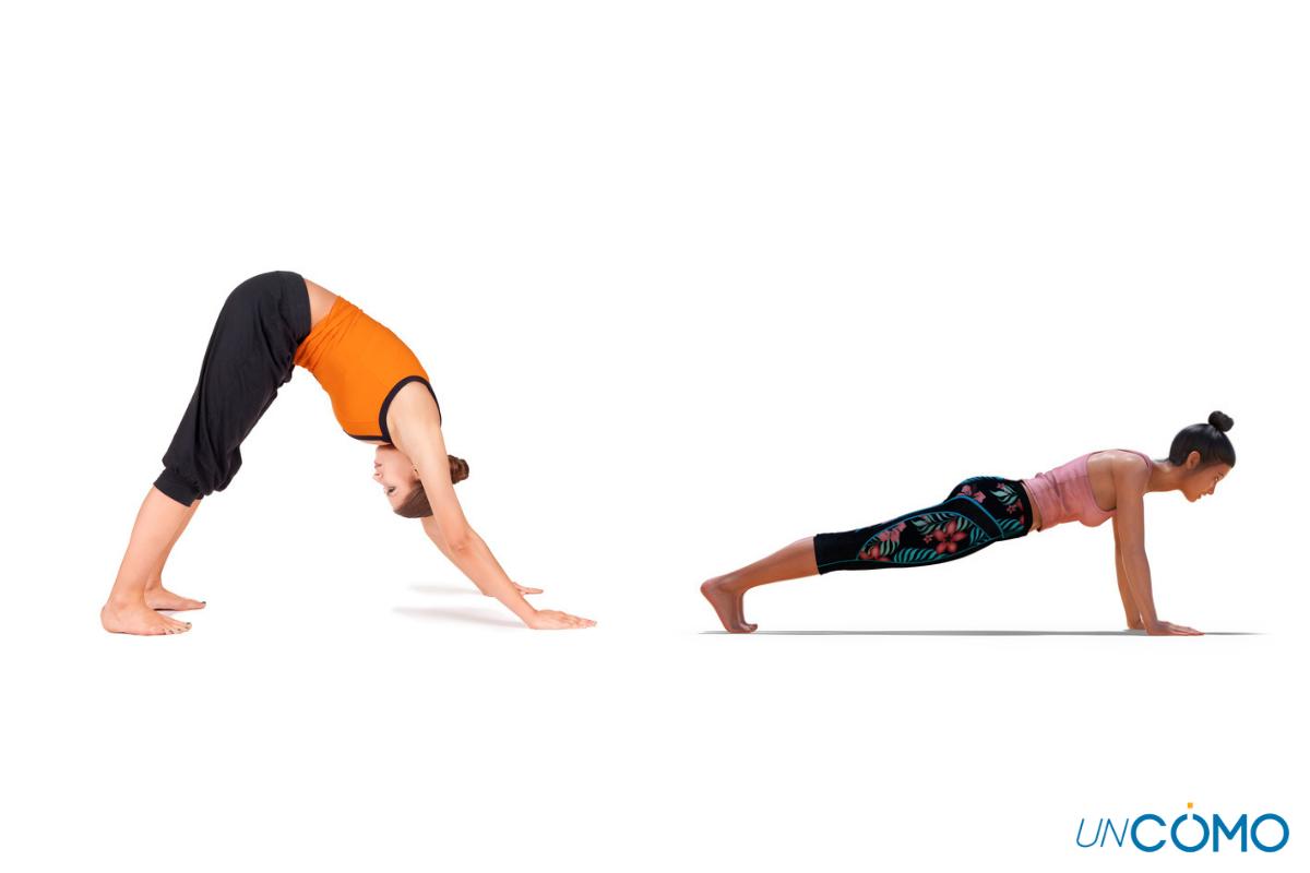 - Desplaza la piernas hacia atrás con los pies juntos. La postura se asemeja el ejercicio de plancha.