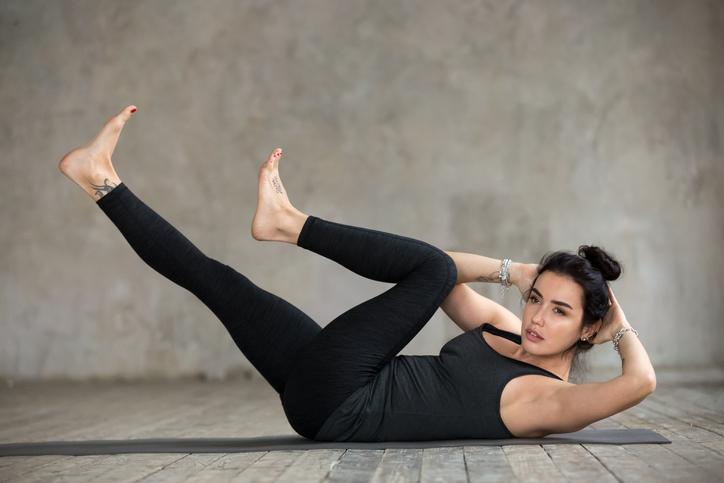 - Eleva el torso e intenta llevar el codo izquierdo hacia la rodilla derecha al mismo tiempo que llevas la rodilla derecha hacia tu codo izquierdo. Intenta acercarte lo más que puedas.
